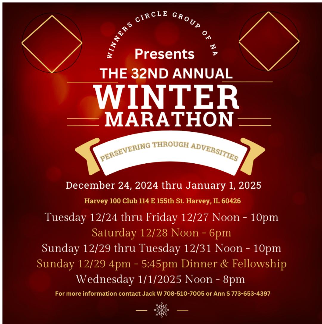This is an annual speakathon presented by the Thursday night Winners Circle group held at the Harvey 100 Club. It is from 12/24/24 to 1/1//5. We have 82 speakers across 9 days, as well as a dinner.