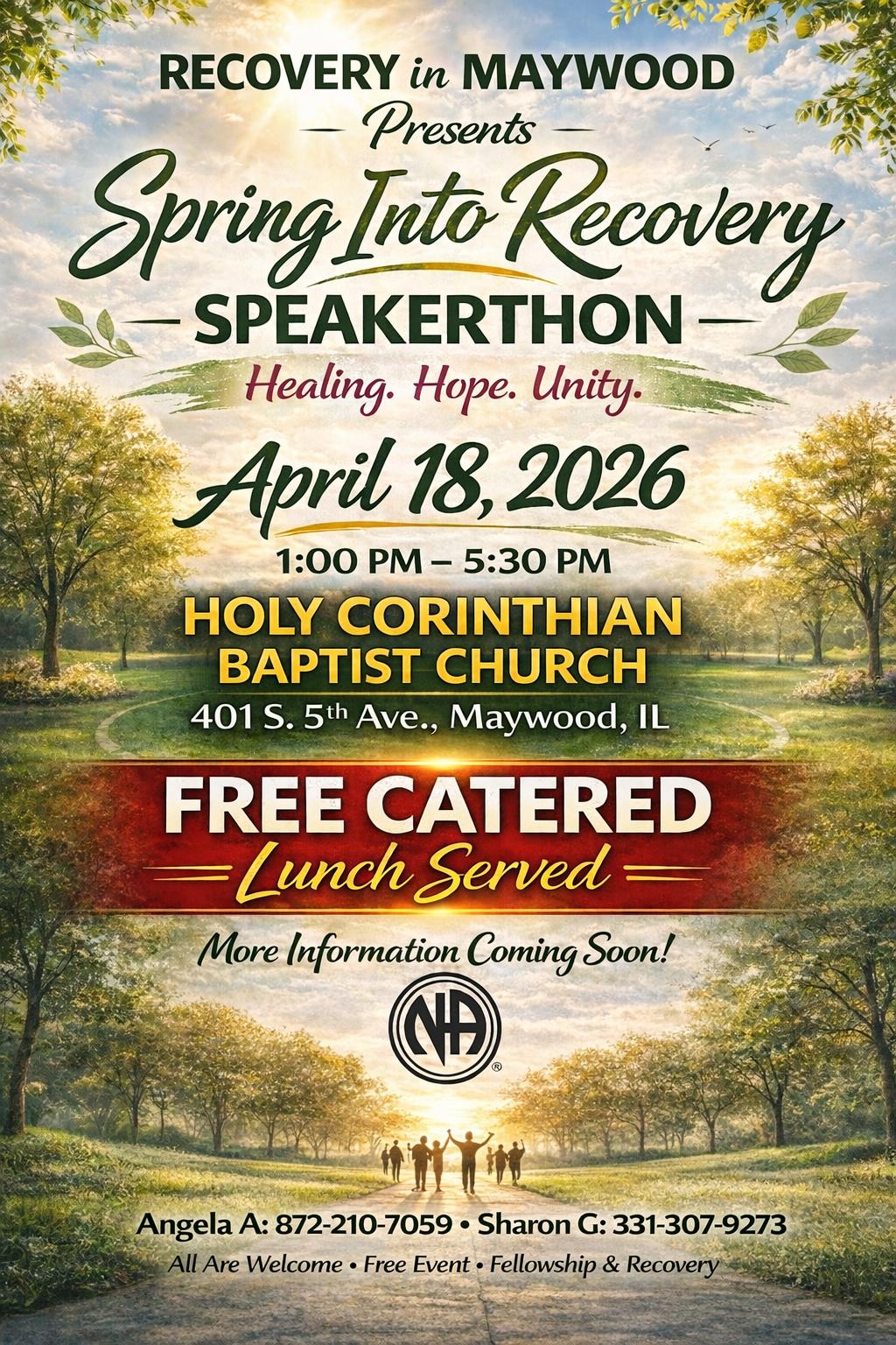 Apr 18 SPRING INTO RECOVERY SPEAKERTHON 1:00 pm - 5:30 pm Holy Corinthian Baptist Church 401 S. 5th Avenue, MAYWOOD Event Details Get Directions