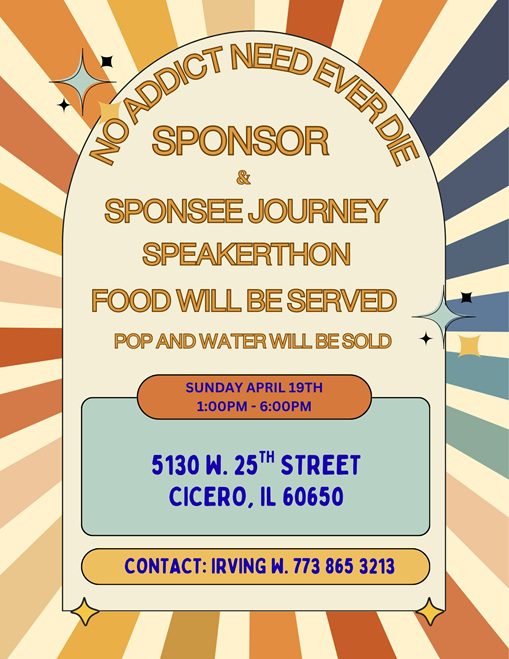 Apr 19 SPONSOR & SPONSEE JOURNEY SPEAKERTHON 1:00 pm - 6:00 pm No Addict Need Ever Die 5130 W. 25th Street, Cicero Event Details Get Directions