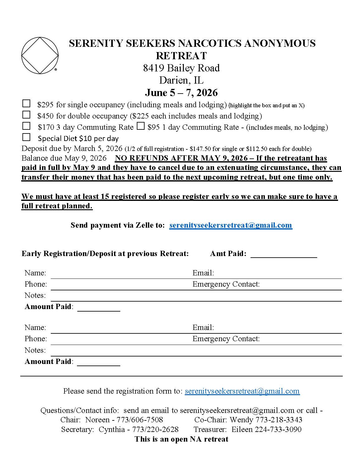 Jun 5 SERENITY SEEKERS NARCOTICS ANONYMOUS RETREAT June 5 @ 8:00 am - June 7 @ 5:00 pm CDT Carmelite Spiritual Center 8419 Bailey Road, Darien Event Details Get Directions