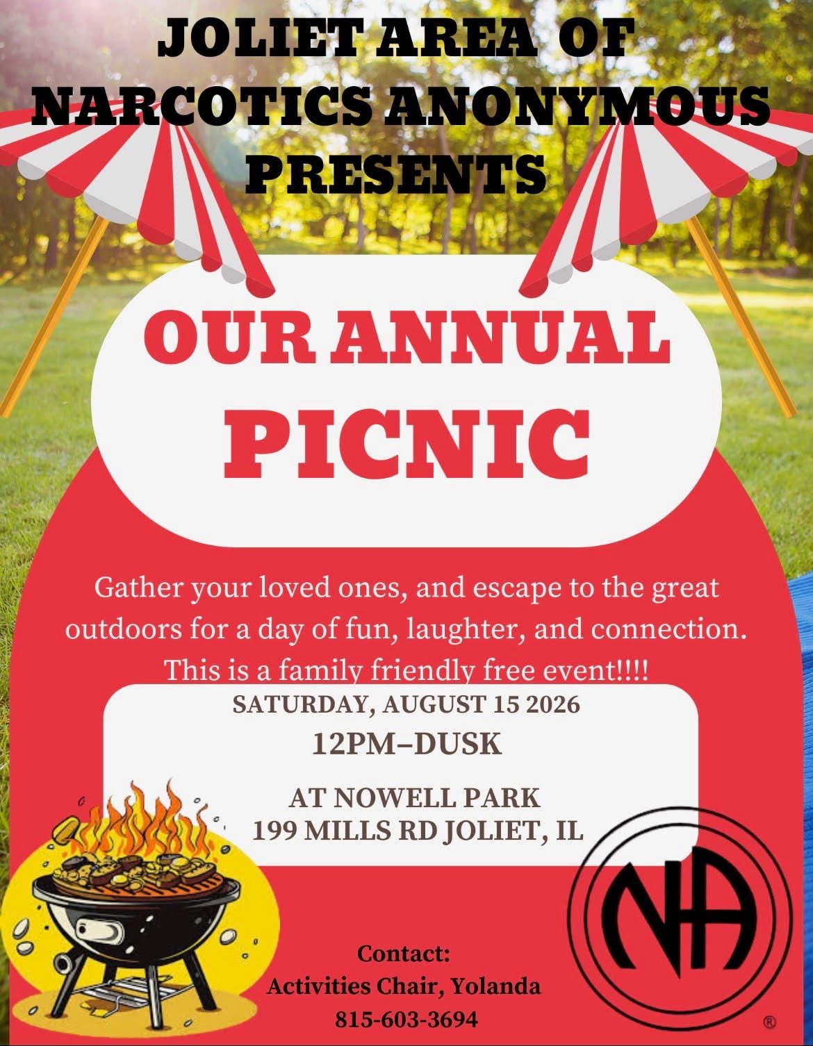 Aug 15 JOLIET AREA OF NARCOTICS ANONYMOUS ANNUAL PICNIC 12:00 pm - 7:00 pm Nowell Park 199 Mills RD, Joliet Event Details Get Directions