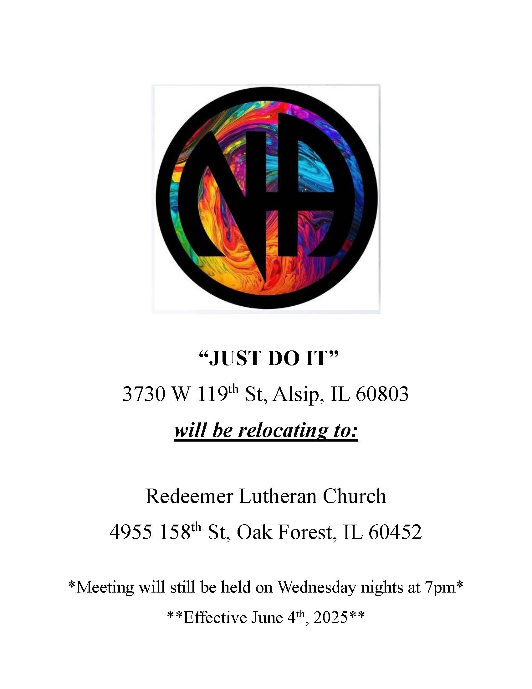 Beginning on Jun 4th 2025 SSA invites you to "JUST DO IT" NEW LOCATION Redeemer Lutheran Church 4955 158th ST. Oak Forest, IL 60452 T