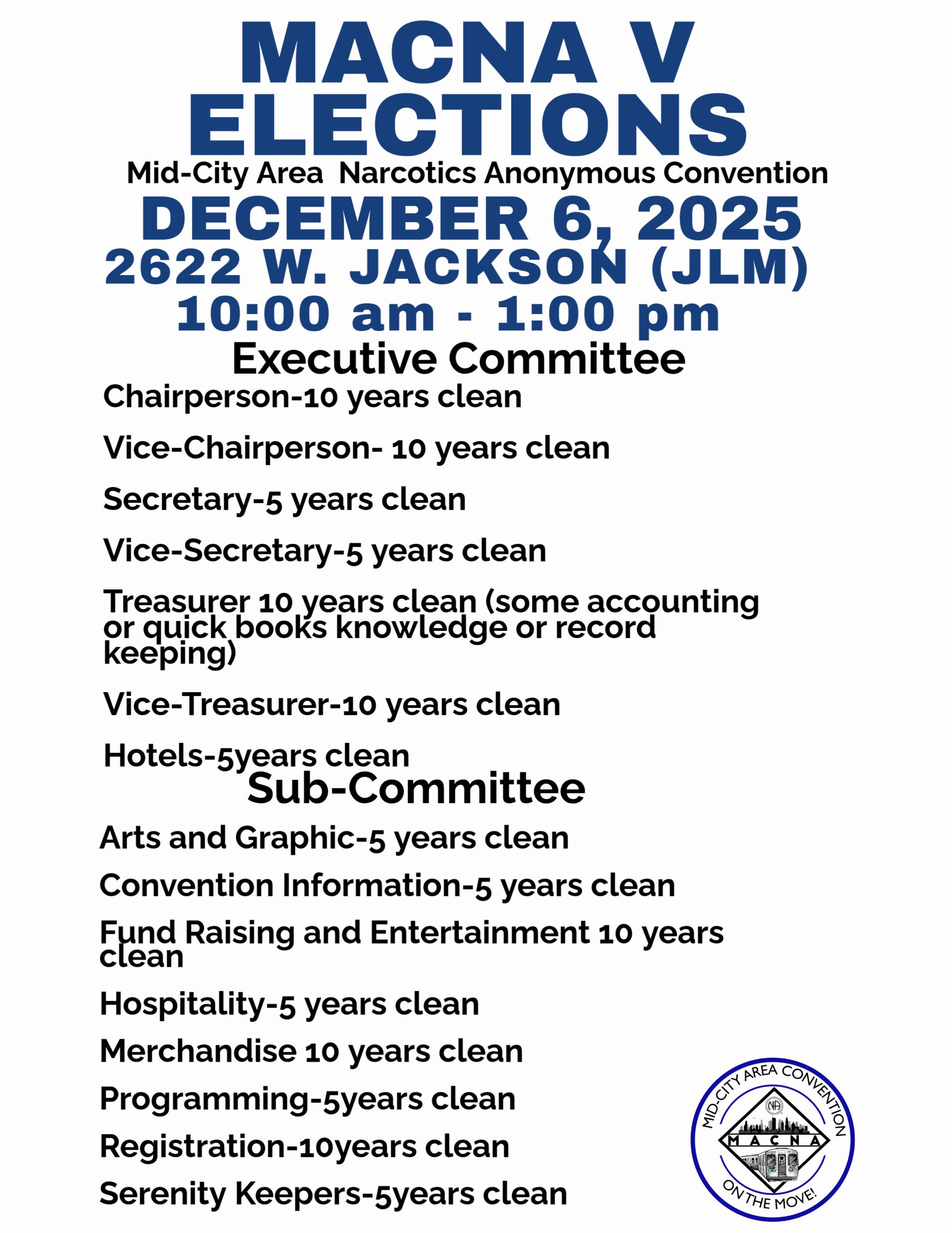 December 6 @ 10:00 am - 1:00 pm CST MACNA V ELECTIONS JLM 2622 W Jackson Blvd, Chicago, IL, United States ELECTIONS MACNA V CONVENTION 2027 Free